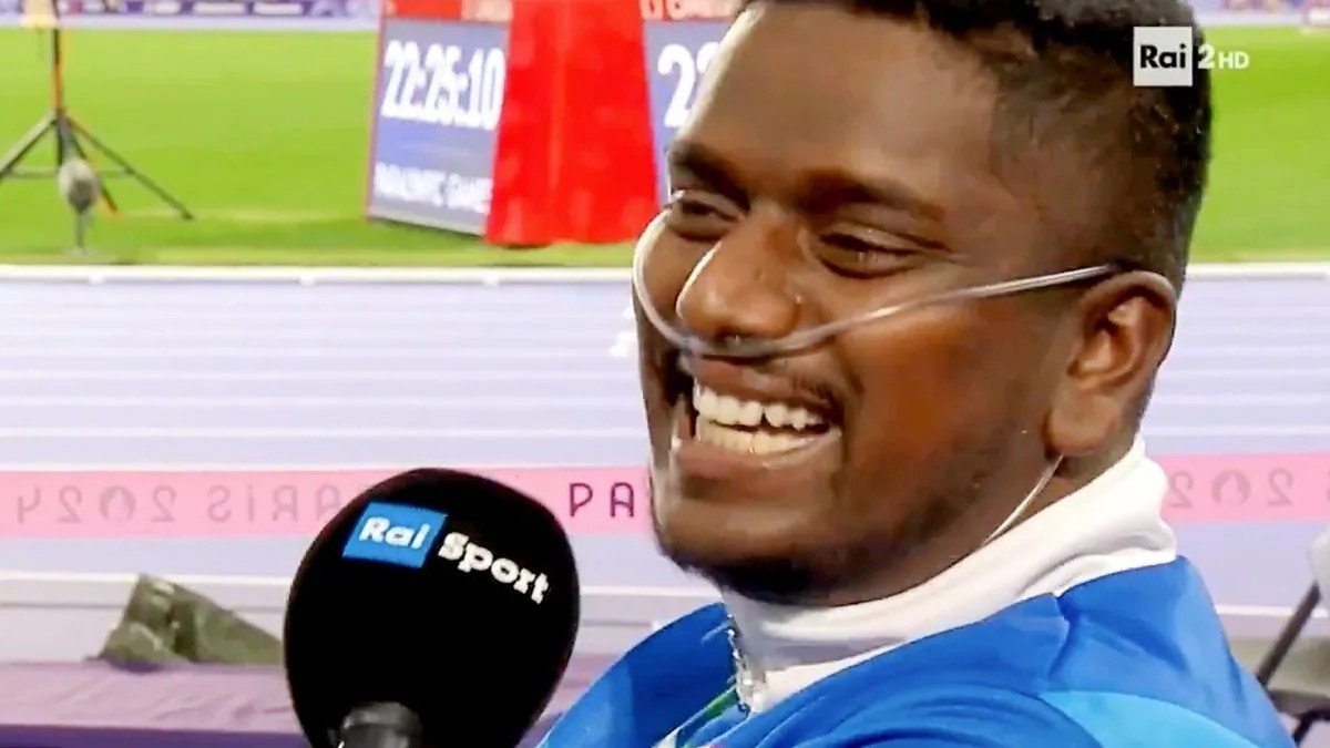 Dopo aver stabilito tre record del mondo nella stessa gara viene intervistato da Elisabetta Caporale di Rai Sport che subito sottolinea quanto sia straordinaria l’impresa compiuta. Lui risponde: «Grazie, grazie a tutti». Elisabetta Caporale allora domanda: «E basta?» e Rigivan Ganeshamoorthy risponde: «Penso di sì», poi aggiunge: «Ringrazio tutte le persone che stanno a casa». Elisabetta caporale gli fa notare che quella è la sua terza gara internazionale e la prima “planetaria”, «forse hai fatto due Grand prix» dice, e Rigivan Ganeshamoorthy risponde: «Non me ricordo, forse uno n’ho fatto. O due. Boh». Quando Elisabetta Caporale gli rilegge le misure dei tre record che ha stabilito, Rigivan Ganeshamoorthy risponde: «Che devo dì?». Elisabetta Caporale dice: «Non lo so» e Rigivan Ganeshamoorthy dice: «Non ho parole neanche per me stesso». Quando Elisabetta Caporale, in riferimento al contesto sportivo in cui si trova, gli domanda: «Questo mondo ti sta cominciando a piacere?», lui risponde: «Ma sì dai, un po’ troppi disabili forse». Poi Elisabetta Caporale dice: «Senti, ma vuoi dire qualcosa a chi ti sta guardando? Vuoi salutare qualcuno? Dedicare questa medaglia d’oro? Di solito si fa» e Rigivan Ganeshamoorthy risponde: «La dedico a mia madre, a mia sorella, al personal trainer Enrico Ruffini, a Francesco La Versa, a Roberto Minnetti, a tutte le persone, a tutta Dragona, a Roma, al decimo municipio, al mio vicino che mi è venuto a trovare e mi ha portato la bandiera». «Meraviglioso» commenta Elisabetta Caporale e Rigivan Ganeshamoorthy dice: «No, no bellissimo. Quella è la cosa più bella penso», «L’amicizia?» chiede Elisabetta Caporale, «L’amicizia, le persone che ti vengono a trovare… Questo vale più di un’amicizia, penso, più di una medaglia d’oro vale questa cosa». Poi dedica la medaglia a tutta la nazione italiana e a tutti i disabili a casa.